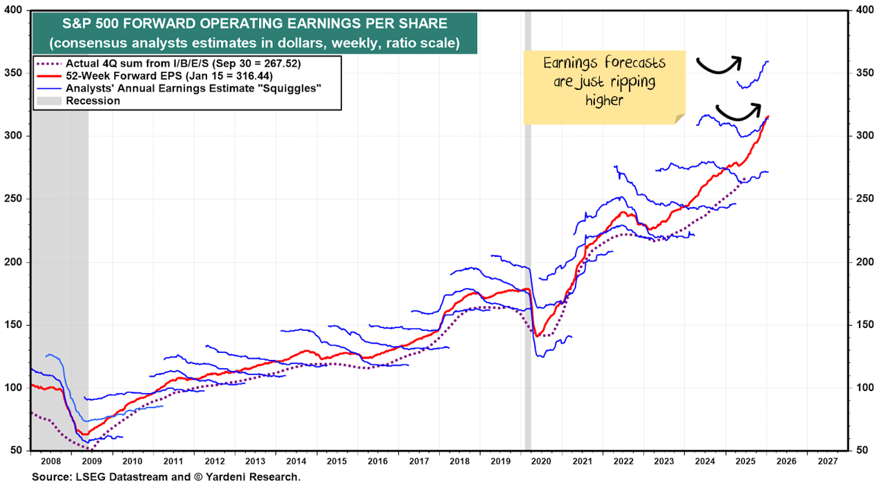The question is whether earnings can grow fast enough to justify those prices. For now, the answer is yes. Forward earnings—the best simple proxy we have—is rising at a rising rate: