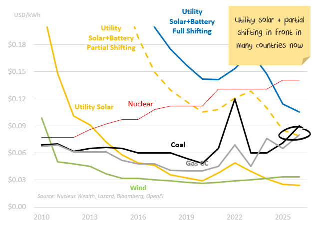 But critics missed the part where batteries entered their own "Experience Curve." Combined with the rising costs of coal and gas—pushed to record highs by the ongoing regional instabilities—Solar + Partial Storage is now officially cheaper than "firm" fossil fuels.
