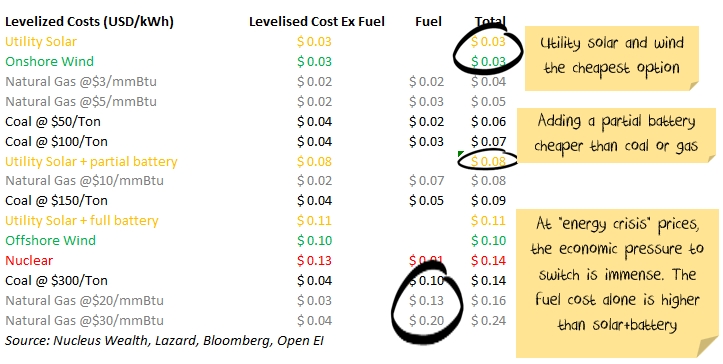 Note that at $20/mmBtu gas prices or $300 coal prices, it becomes more economical to shut down power plants in favour of new solar or wind + batteries.