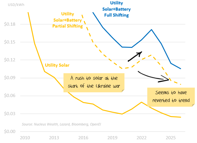 The fossil fuel endgame: Legacy fossil fuel companies are likely about to make super profits in the short term, driven by underinvestment and supply constraints. Take those profits if you hold them, but be warned: the end is coming much faster than linear forecasts suggest. There is a good short-term argument to use these stocks as a hedge for the Hormuz Strait being closed. But it is not a forever bet.