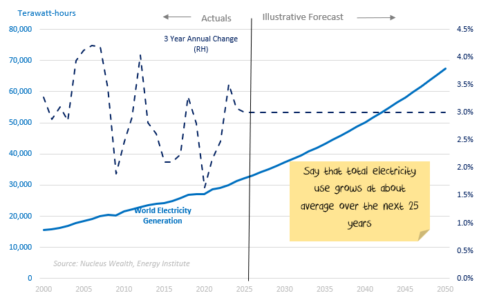 To illustrate, consider a world of 3% electricity growth, supported by a switch to EVs and data centres, constrained by lower population growth: