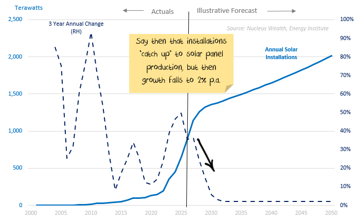 Right now, the bottleneck is not solar panel production, but rather the installation and permitting. Let's say installation catches up to production, and then promptly falls to a 2% growth rate: