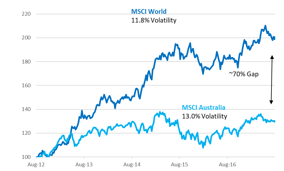 What this has meant over the last five years is that not only have international stocks significantly outperformed Australian stocks over the past five years but that they have done so with less volatility.